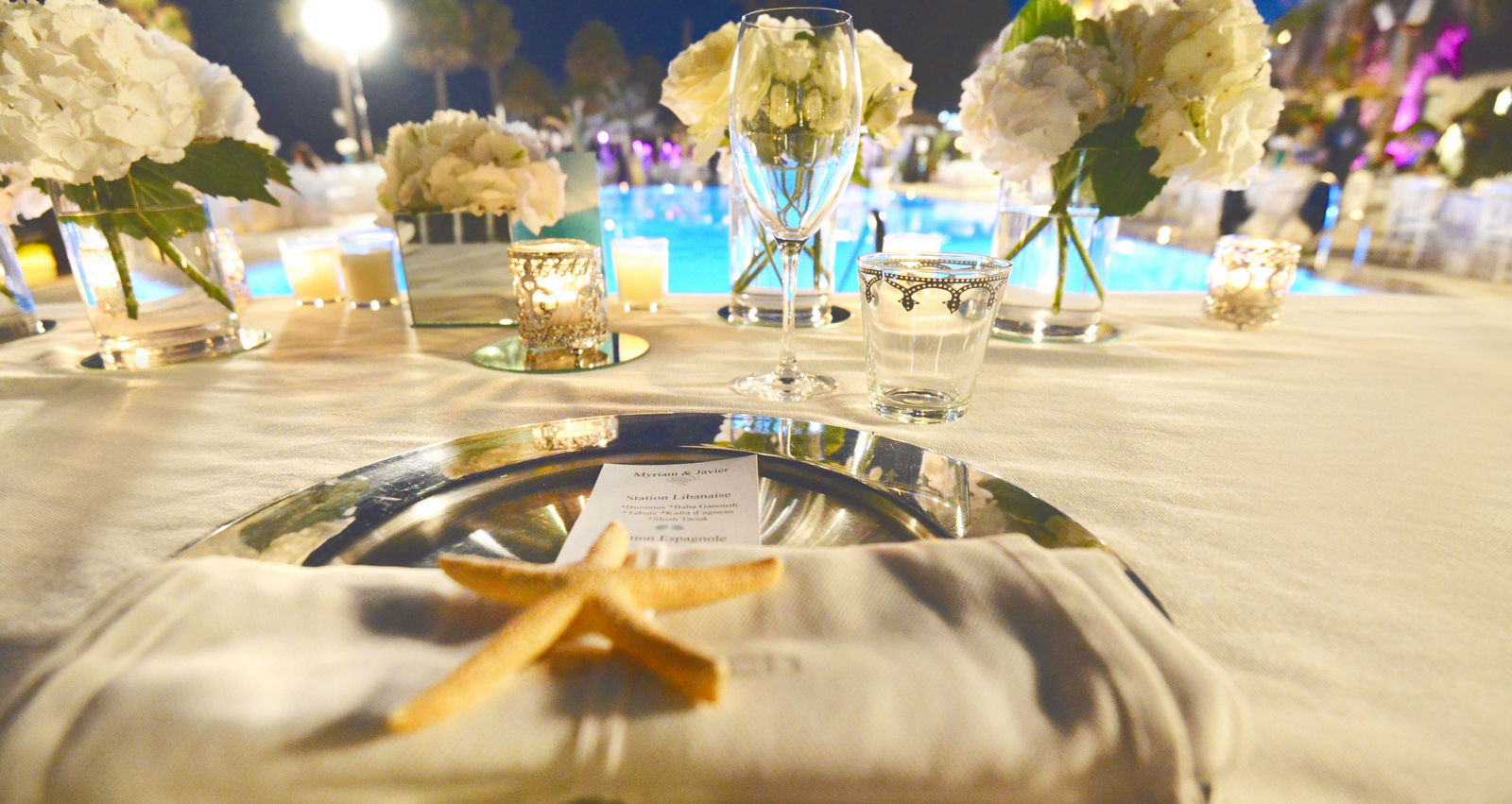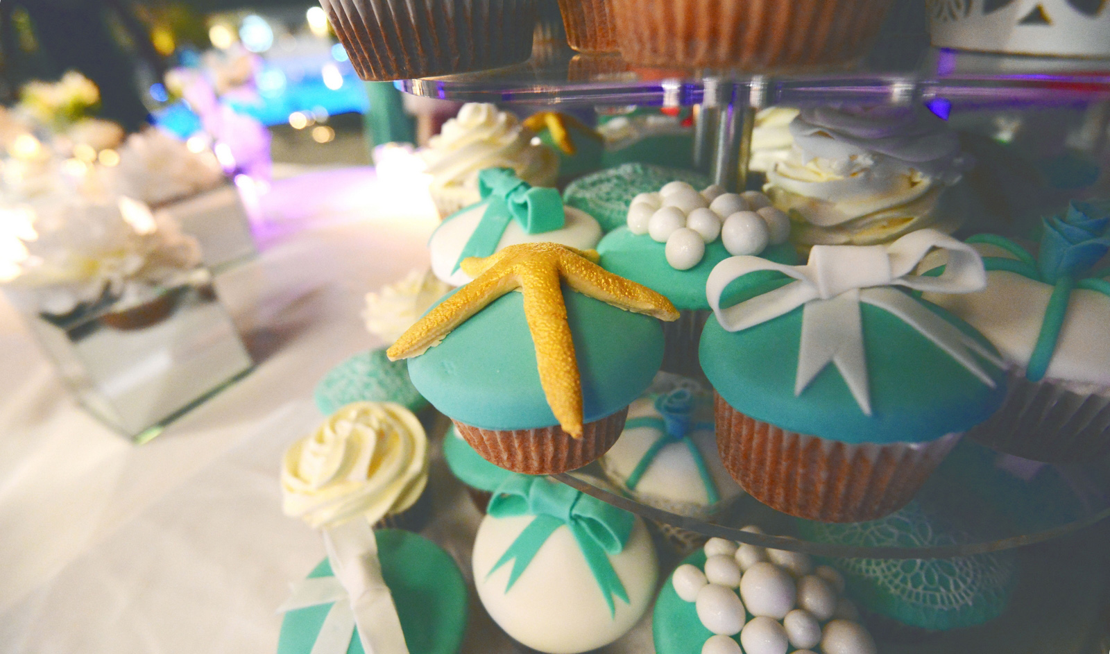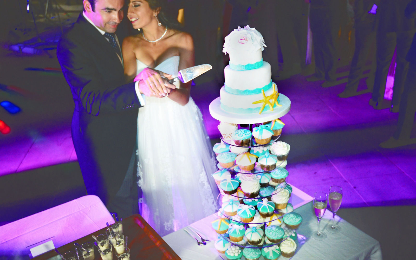 The wedding had a Beach Theme. The cocktail was on the sand and we had a Hawaiian Band that played exotic music and they were serving special cocktails. For dinner, we had a buffet with different type of food. We had Lebanese, Spanish and a Japanese Peruvian fusion. We had belly dancers to entertain the guests during the dinner and then after the cake and the speech, we had another type of band to start the night on the right track. Then when the DJ started, we had a saxophonist and 2 persons doing a fire show. We had entertainment the whole time because we wanted to surprise our guests and escape from the traditional weddings. The cake was also white and blue and decorated with starfish. To make it easier for our guests and us we opted for a beautiful 3 floor cupcakes that didn’t need to be cut.