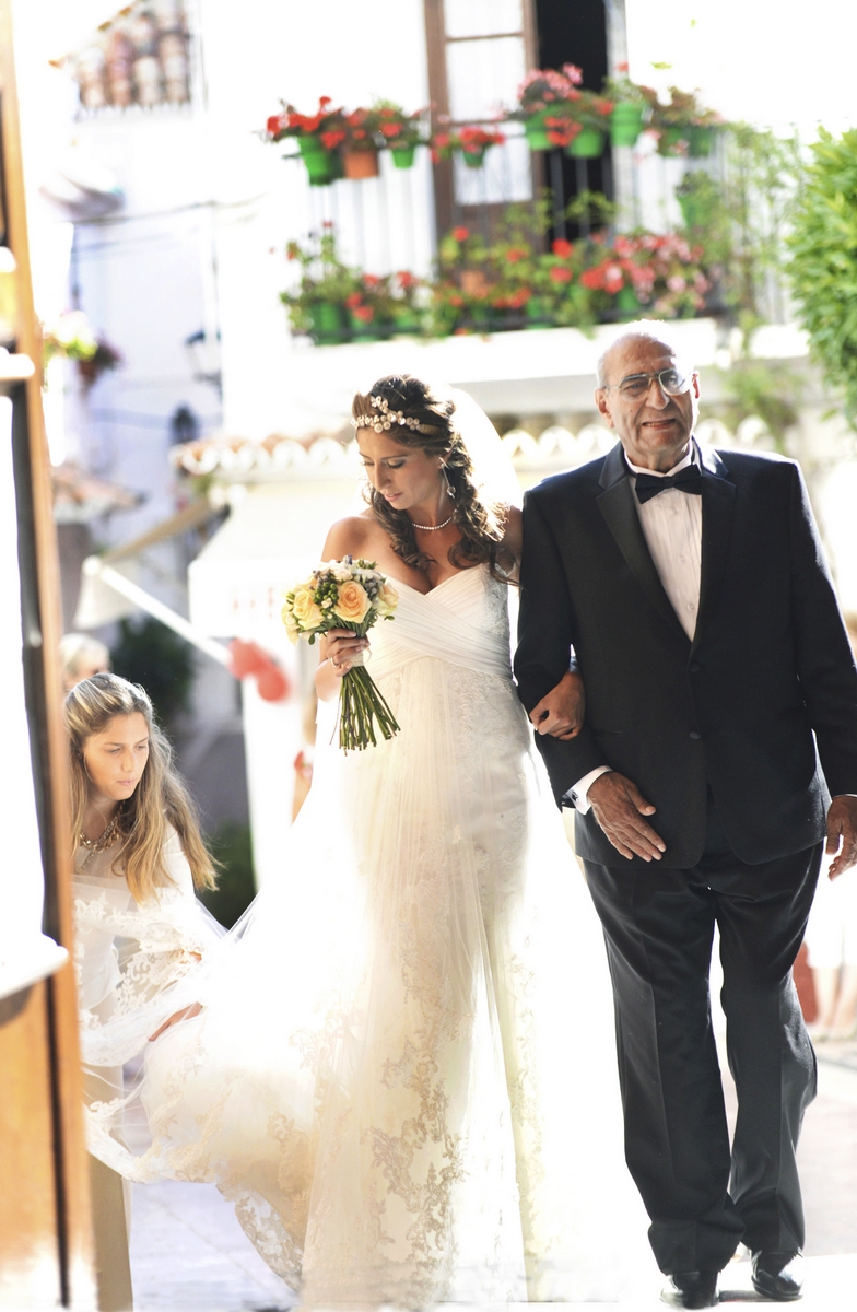 My style for the wedding was elegant and at the same time fresh. Having the celebration on the beach, I opted for an elegant strapless wedding dress with laces. The dress was adjusted and had 2 layers. My bridesmaids where wearing blue mint strapless dresses and their style matched mine. I chose white flowers at the church and at the venue. The decoration was very elegant and had a beach theme. Everything was white and blue and the guests where seated on different islands (tables). The ceremony was in the Iglesia de Nuestra Senora de la Encarnacion in the middle of the old Marbella. The church is so beautiful that I did not have to decorate it that much.